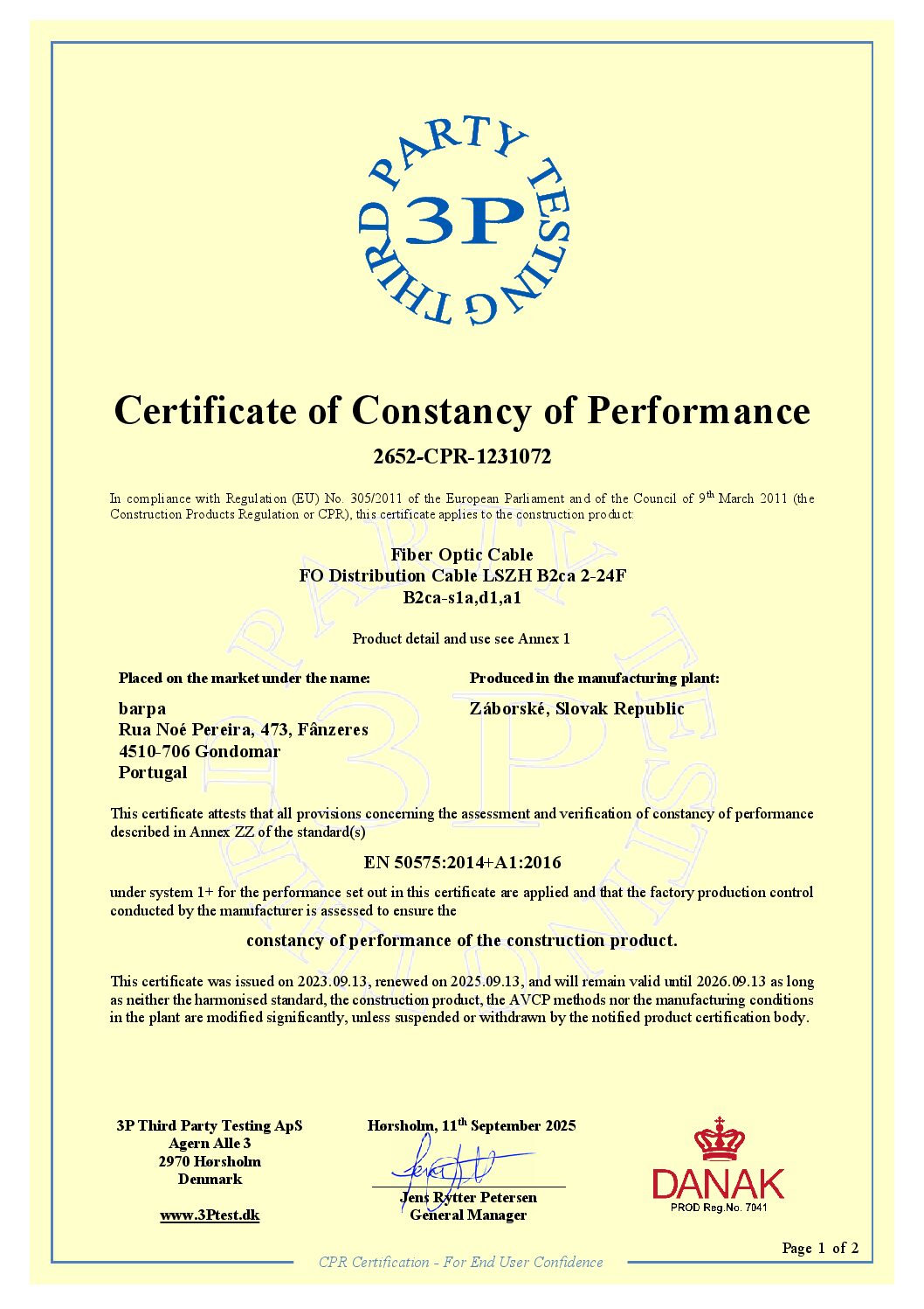 Jun 25, 2024 0 mins reading Data Center Cable 2,0mm for MPO Patch Cord – Certificate of Constancy of Performance barpaadminuser