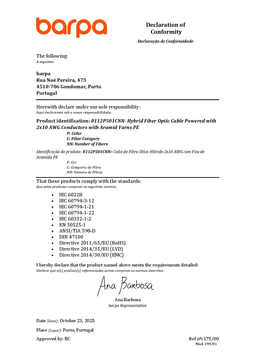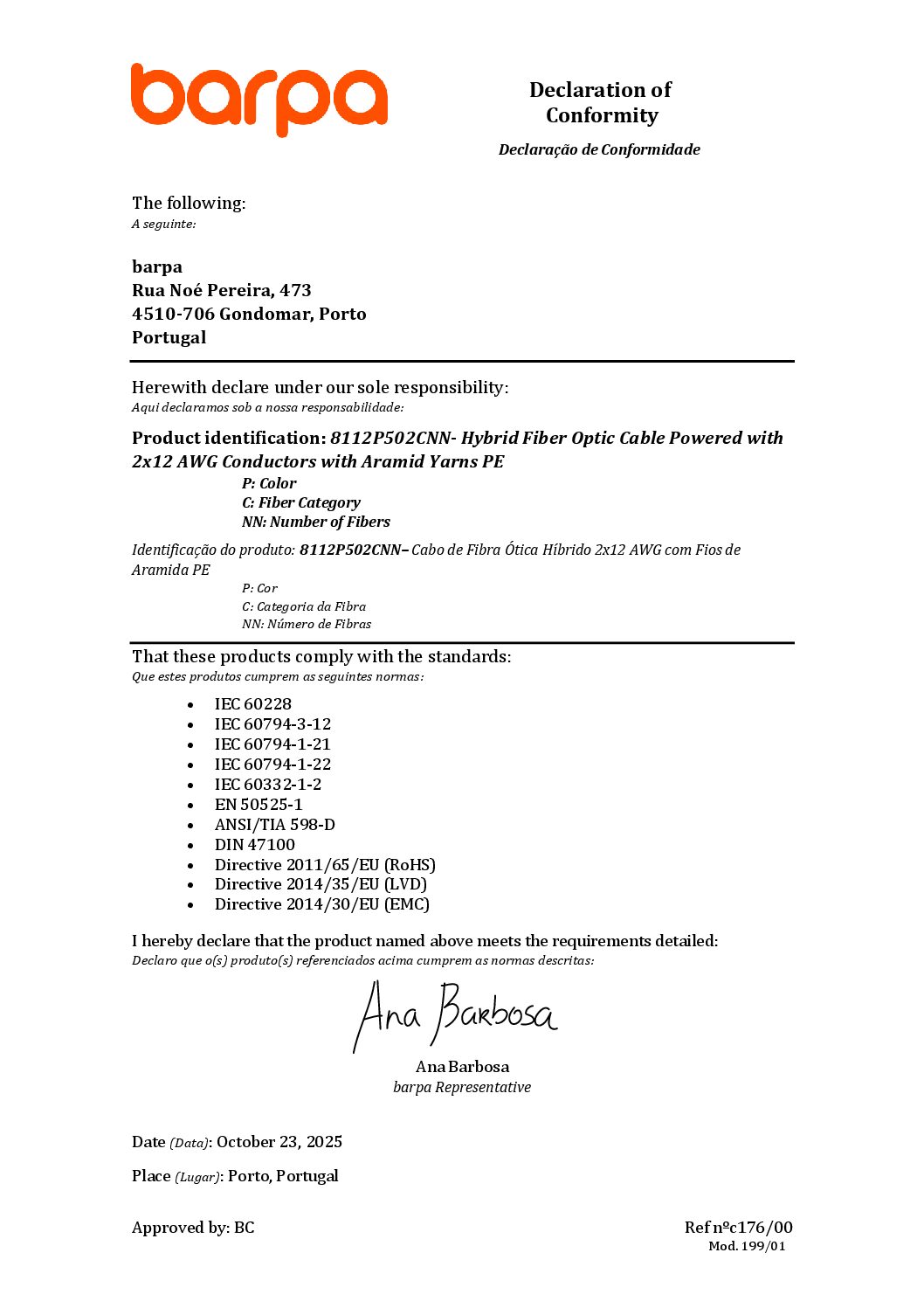 Nov 19, 2025 0 mins reading Hybrid Cable 2×12 AWG with Aramid Yarns – PE – Declaration of Conformity barpaadminuser
